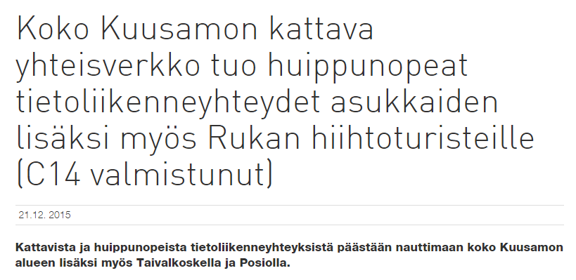 Suomen Yhteisverkko julkaisi tänään valheellisen tiedotteen että C14 alue (mm. Posio) olisi valmis. Tosi asiassa useita linkkejä uupuu vieläkin.